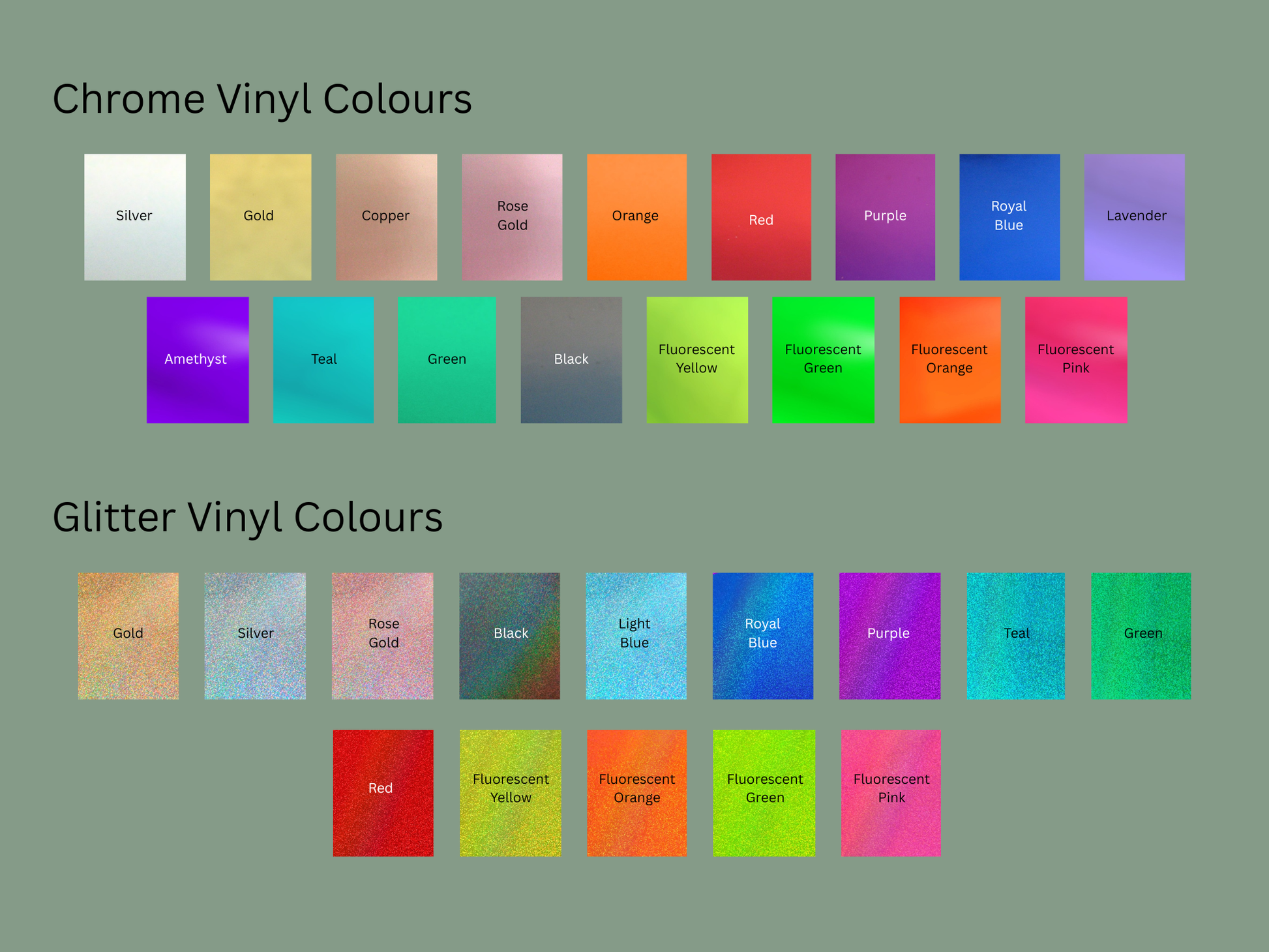 Many colour options available including gloss, glitters, chromes and metallics.