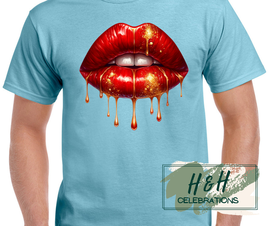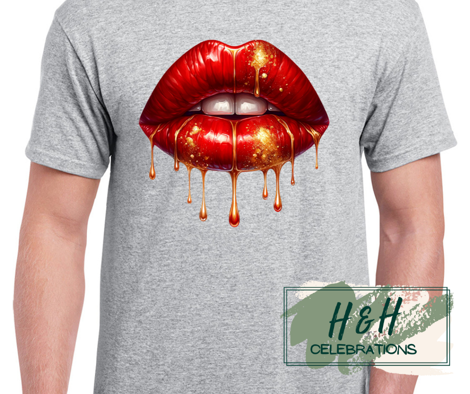 Make a bold statement with this striking women's t-shirt, featuring a captivating design of luscious red lips adorned with an elegant golden drip finish. The luxurious metallic detailing adds sophistication and glamour to a timeless motif, creating a piece that effortlessly transitions from casual to statement-making. Available in 13 versatile colours, you'll find the perfect shade to match your personal style. Crafted for comfort and durability, this tee combines artistic flair with everyday wearability, ideal for those who appreciate fashion with personality and edge.
