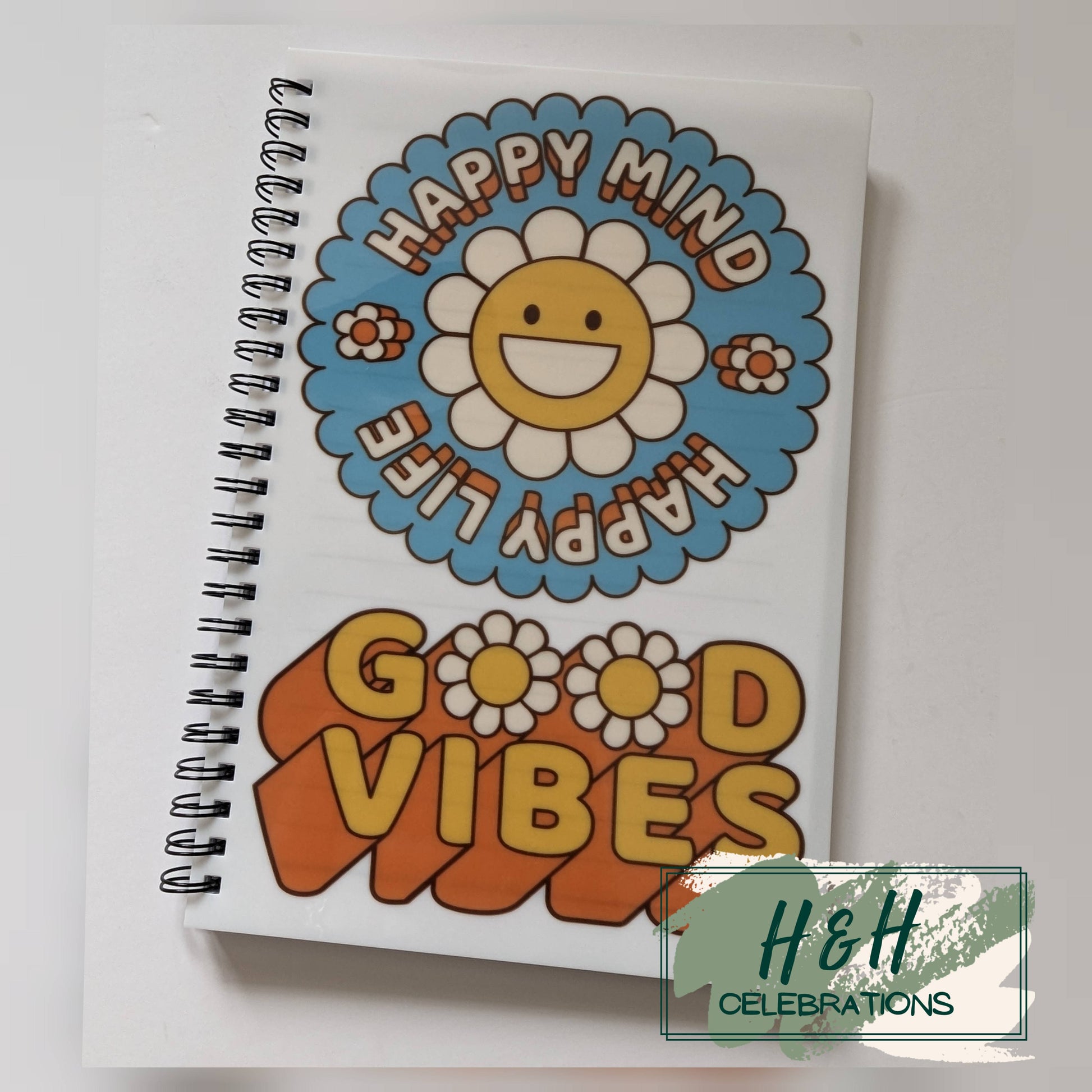 A retro vibe happy mind, happy life design. Featuring a smiling flower with happy mind happy life around it and the wording good vibes underneath, ideal for your own use or to give as a gift.
