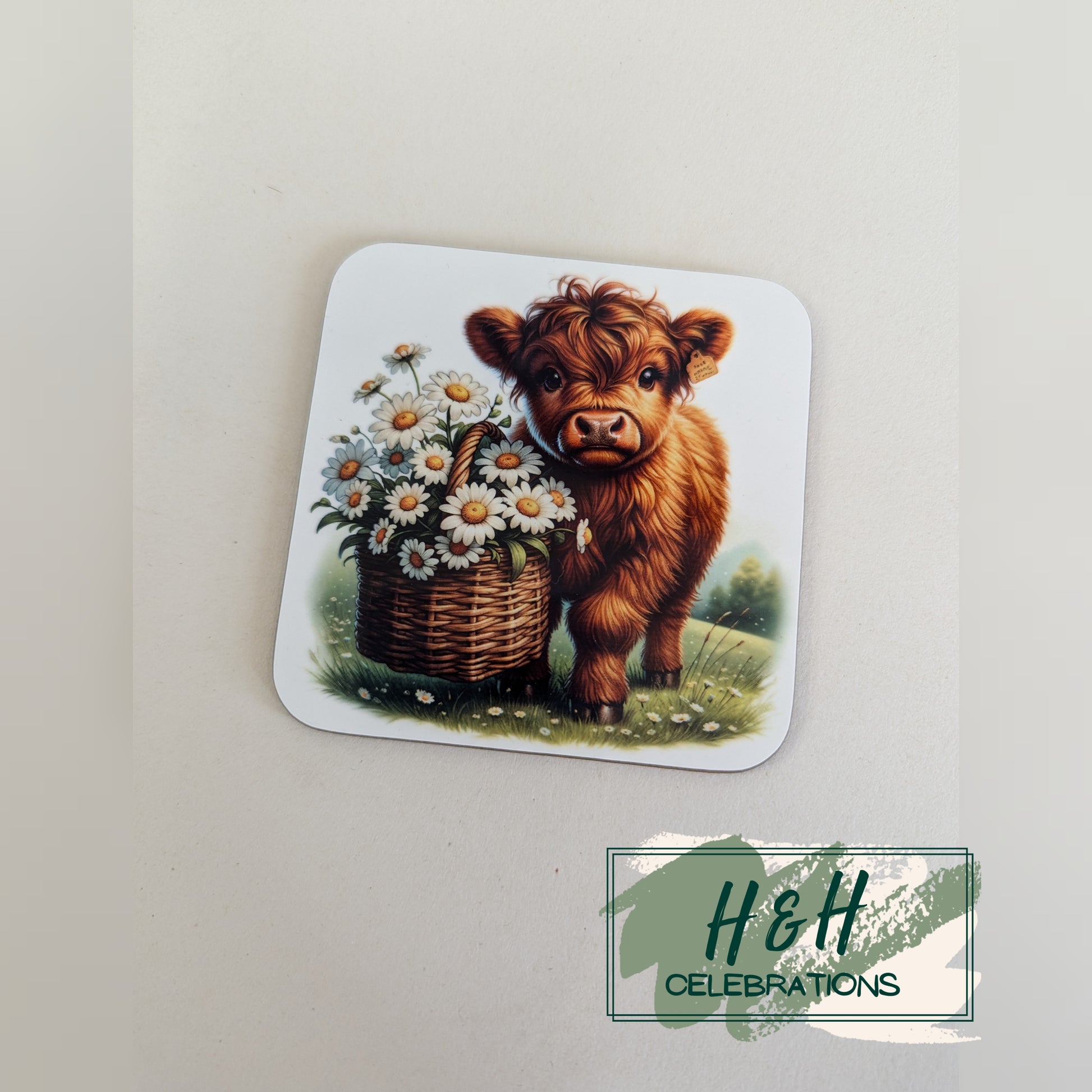 Highland cow with flower basket print mdf coaster.