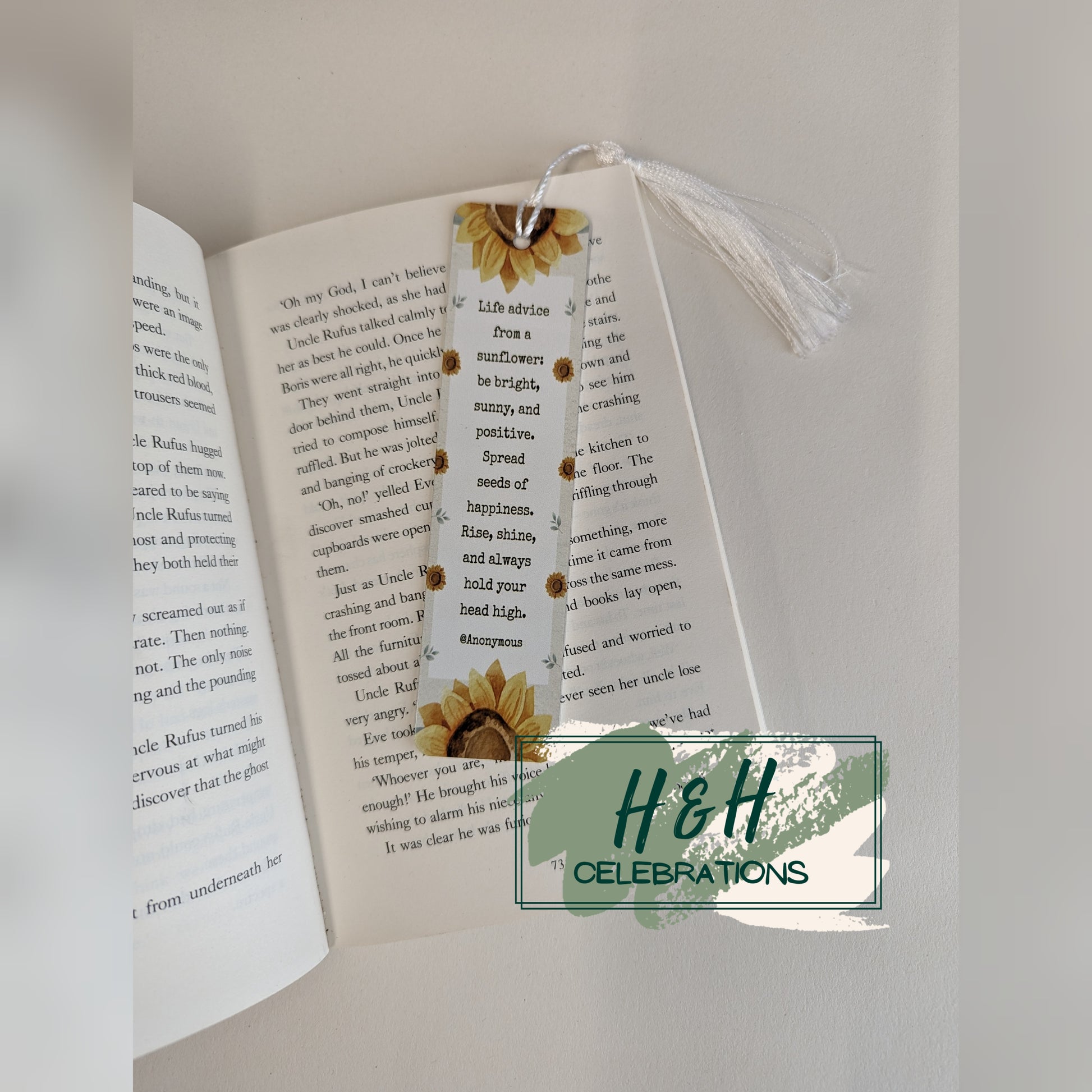 This bookmark depicts a sunflower design with the wording "Life advice from a sunflower; be bright, sunny and positive. Spread seeds of happiness. Rise, shine and always hold your head high."
