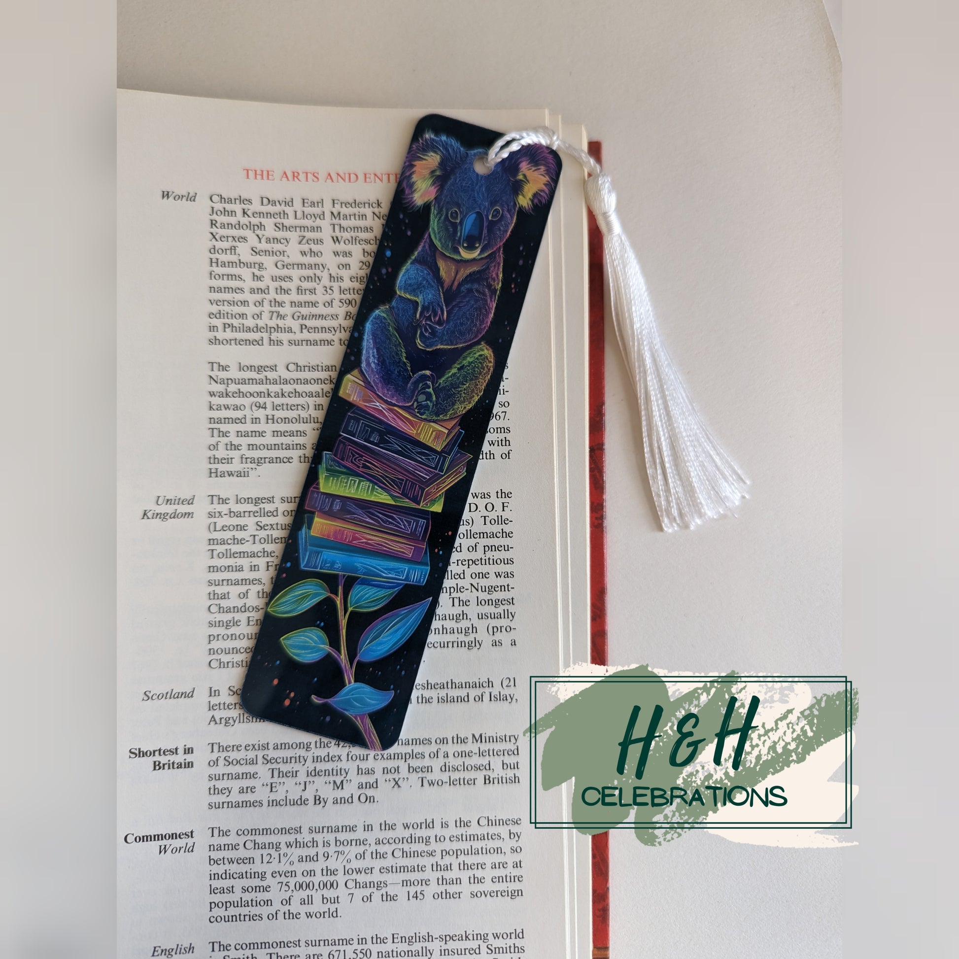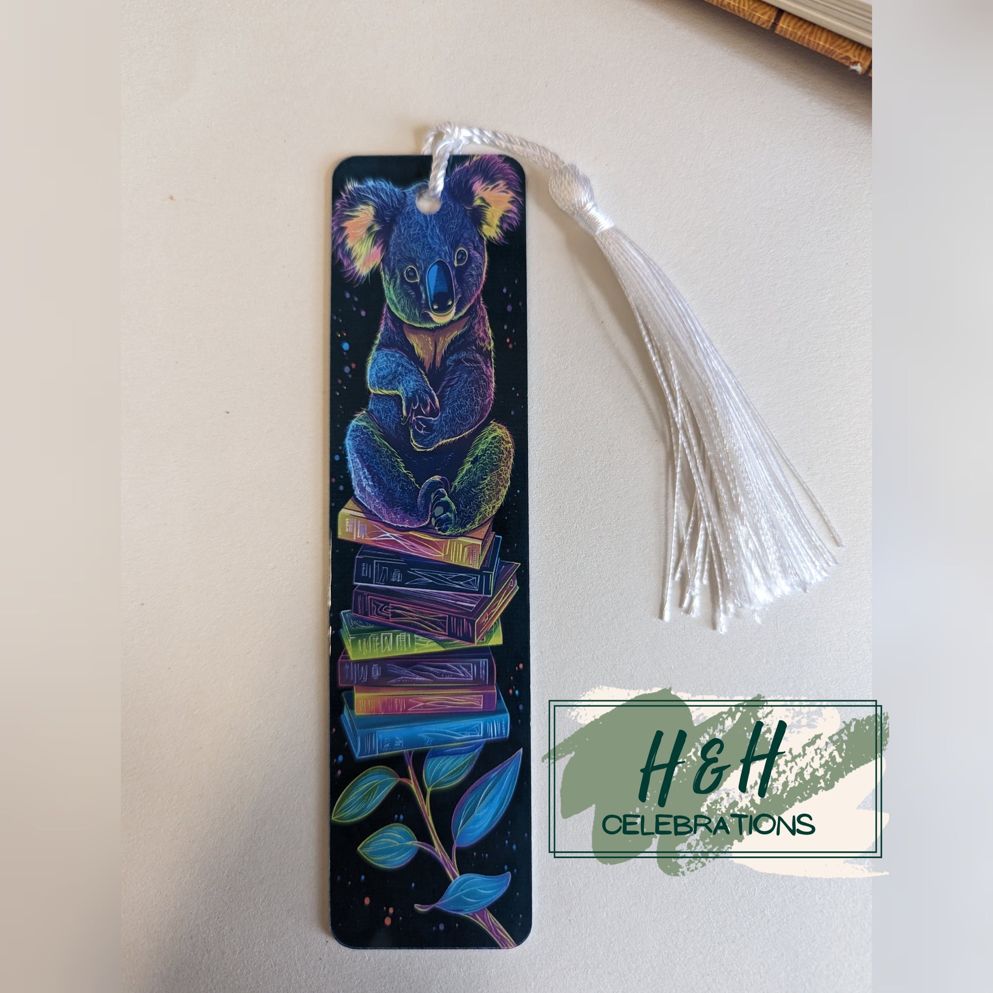 This bookmark depicts a neon Koala sitting on a stack of books to finish.