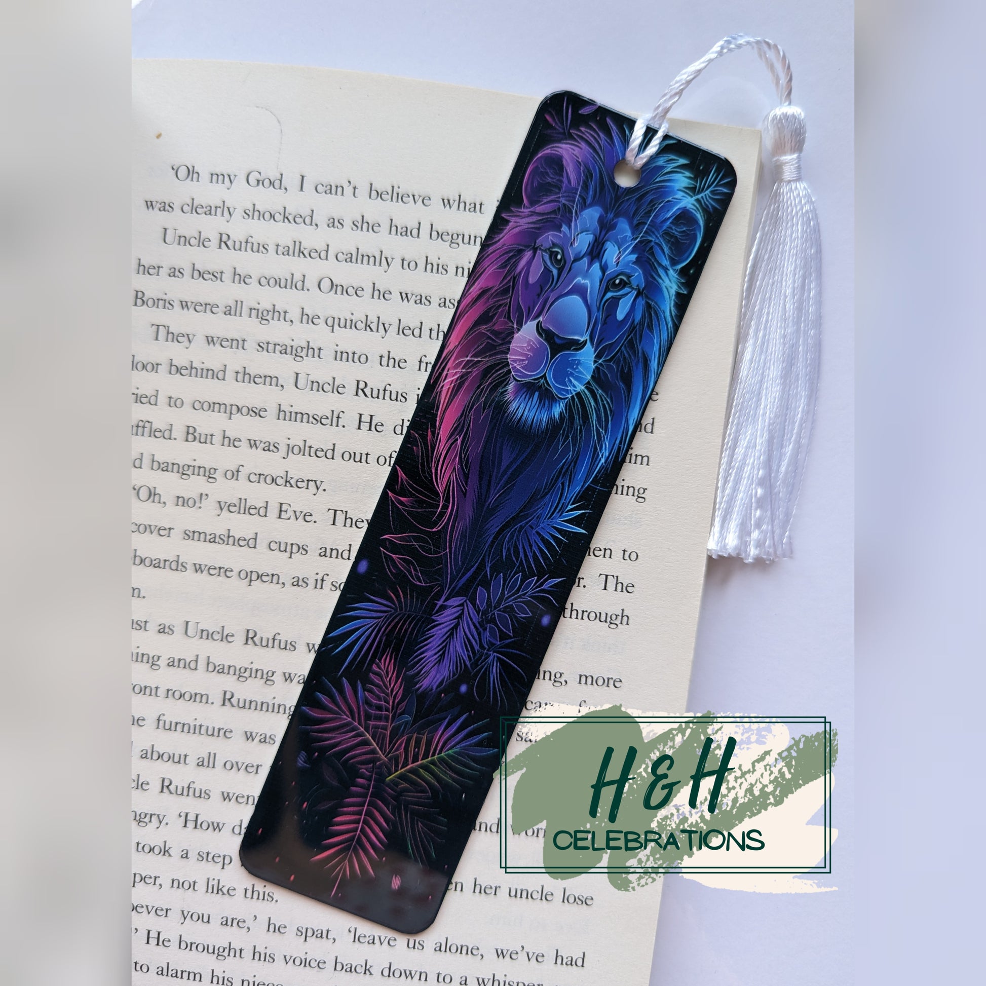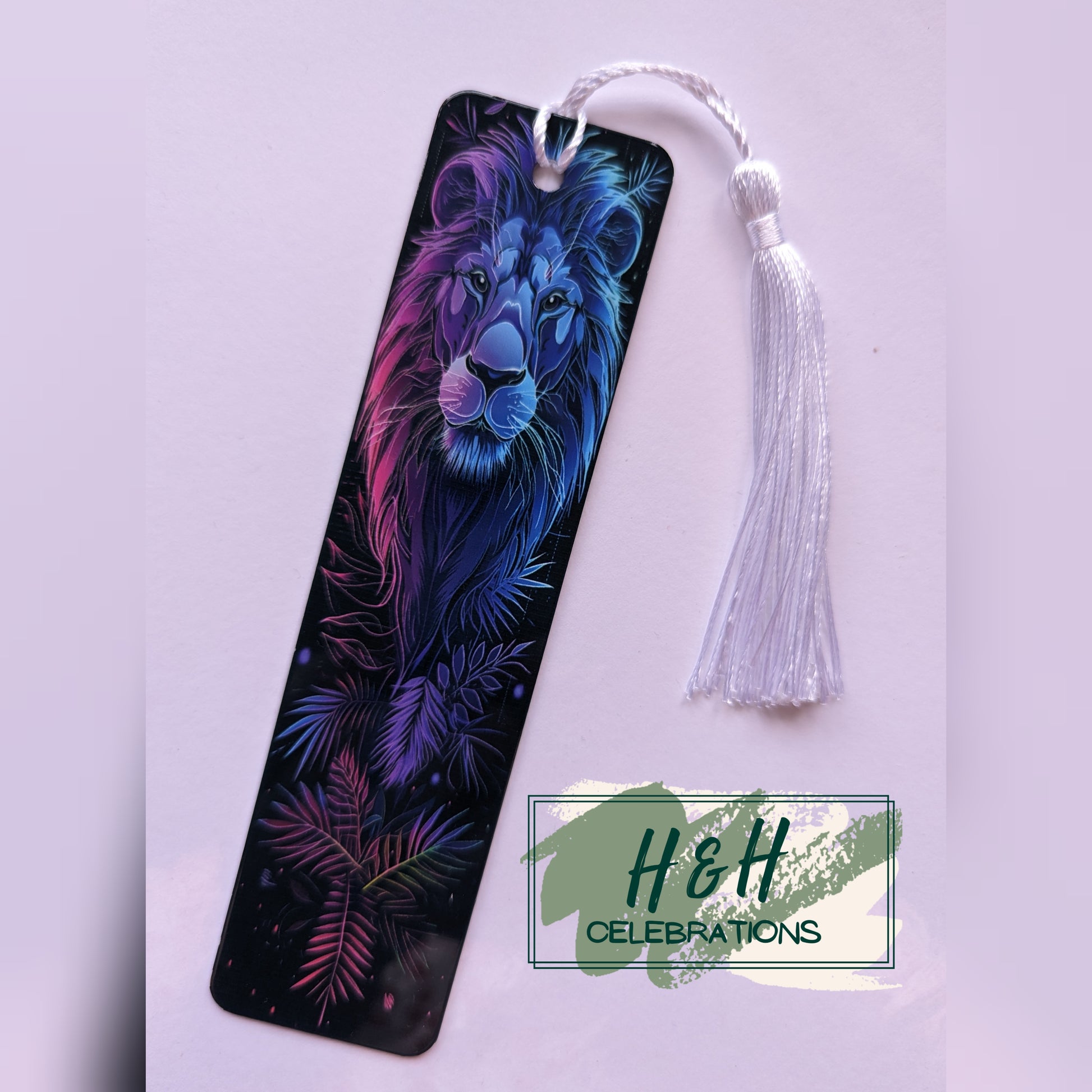 This bookmark depicts a black background with neon lion and leaf detailing to finish.