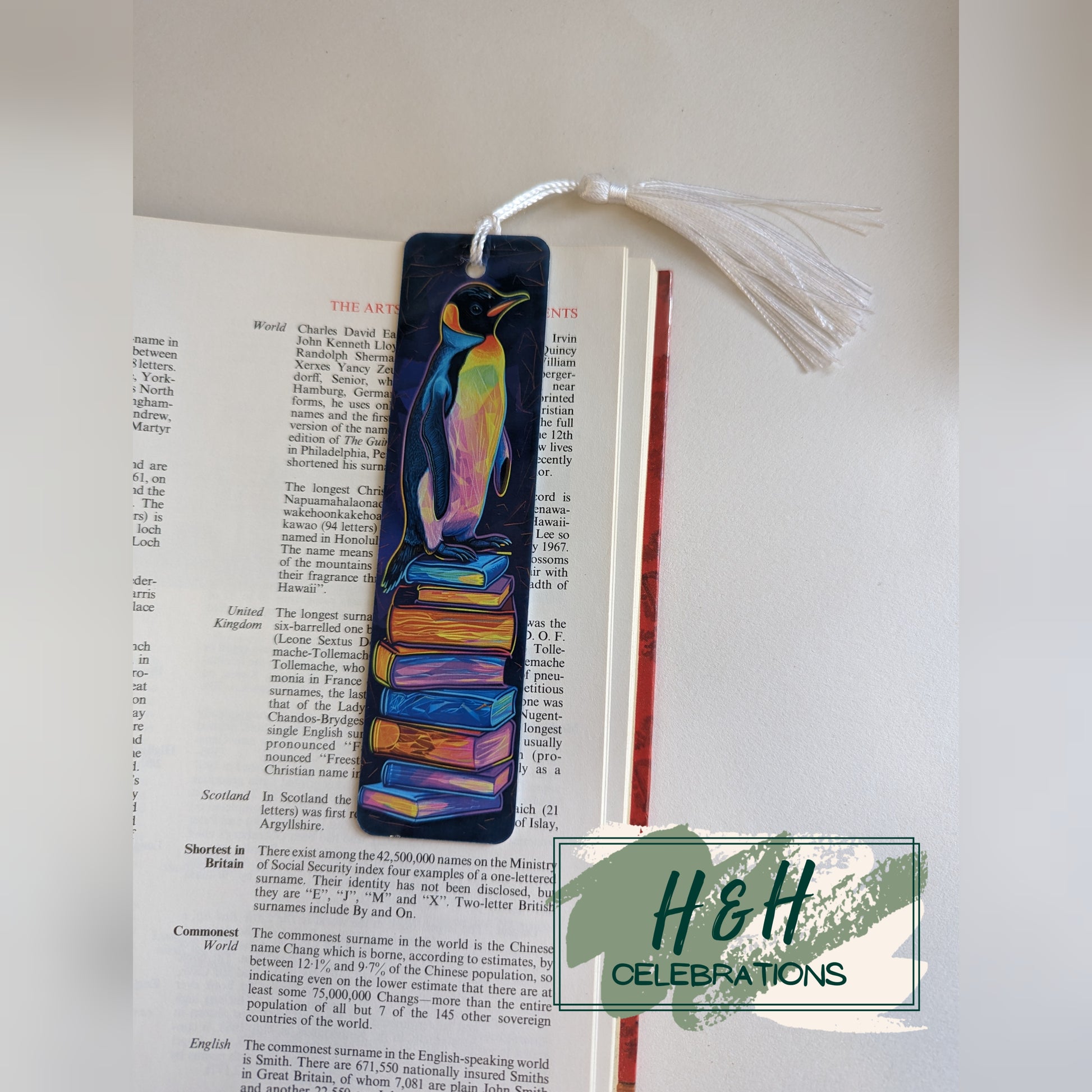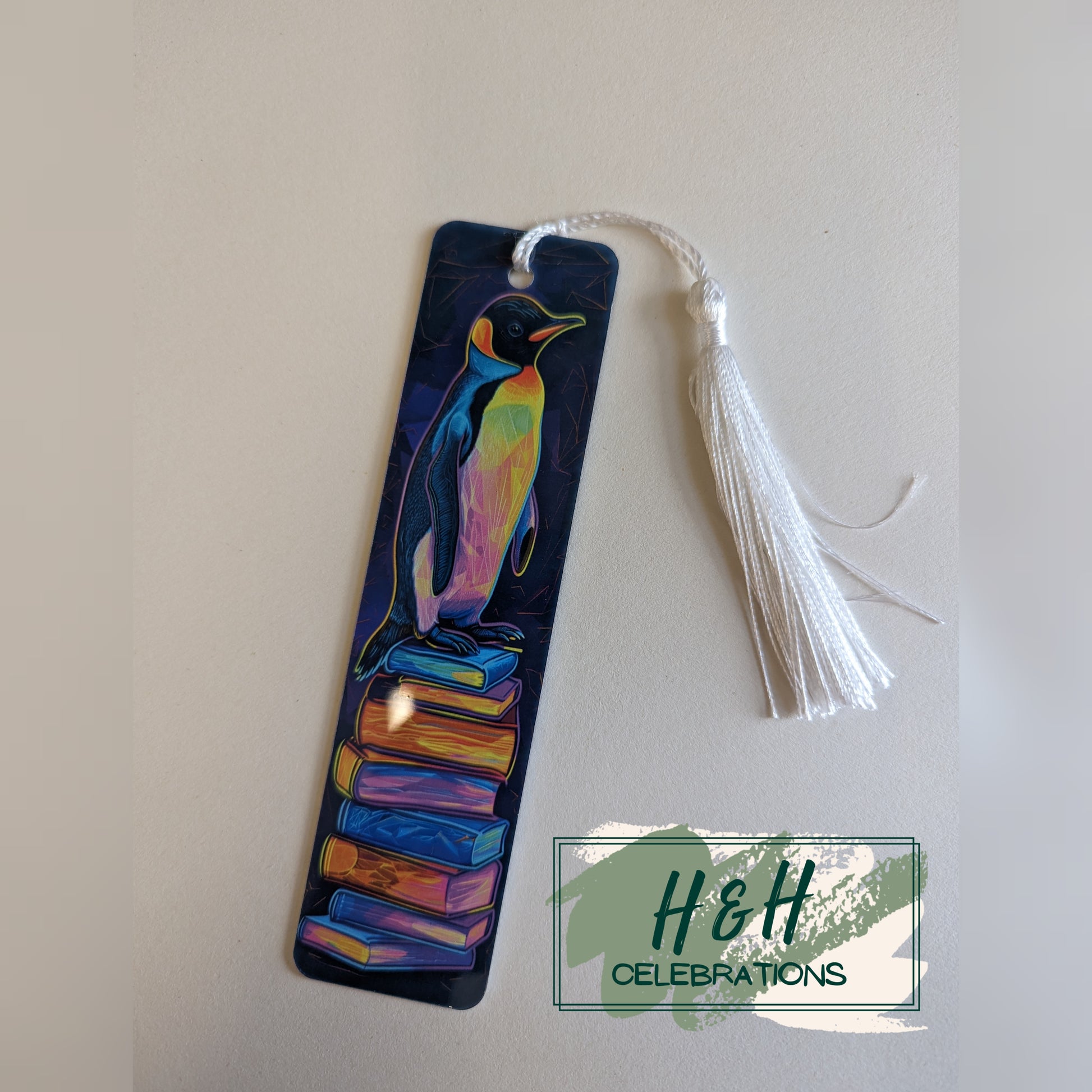 This bookmark depicts a neon coloured penguin standing on a stack of books to finish.