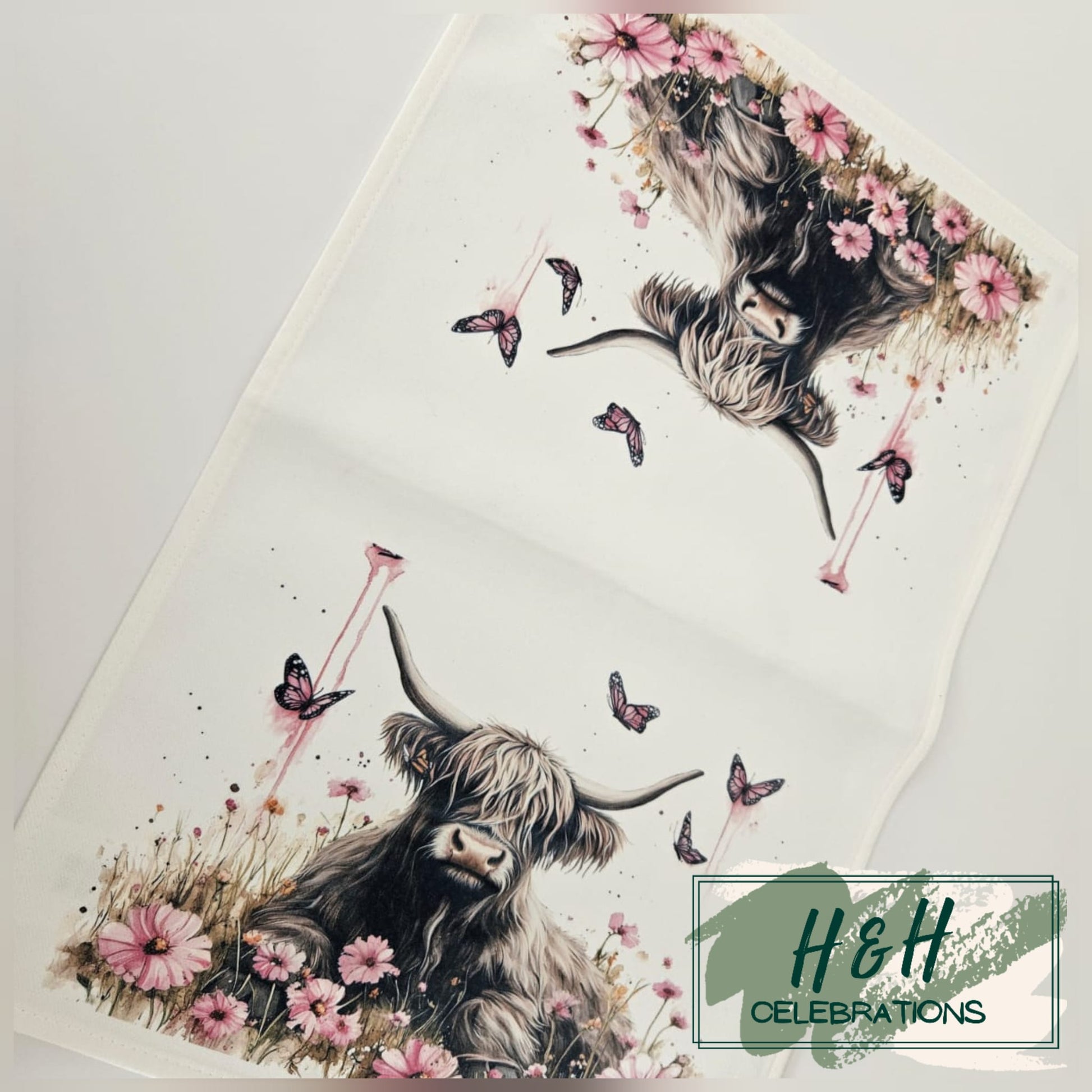 This Pink Floral Highland Cow Tea Towel is crafted from 100% Panama cotton, offering excellent absorbency and durability.