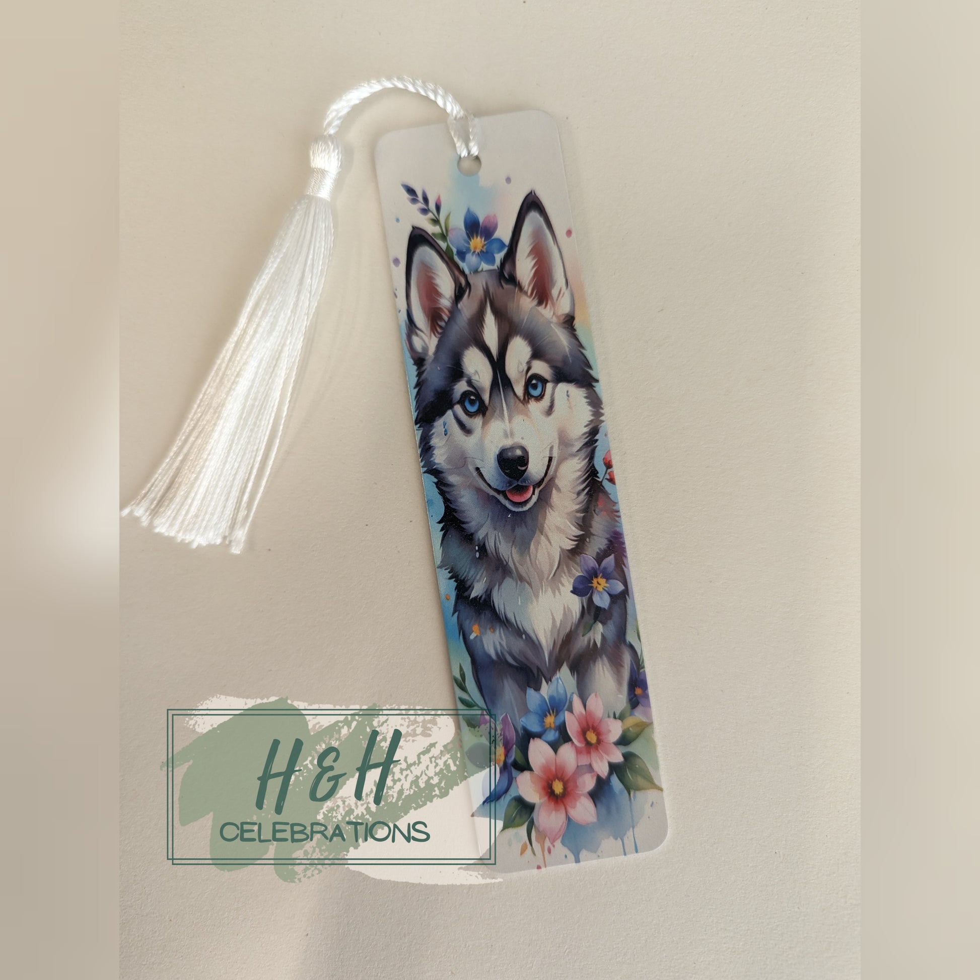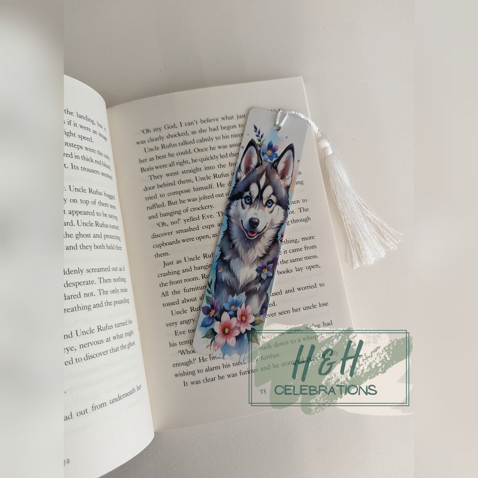 This bookmark depicts a cute puppy finished with an arrangement of flowers.