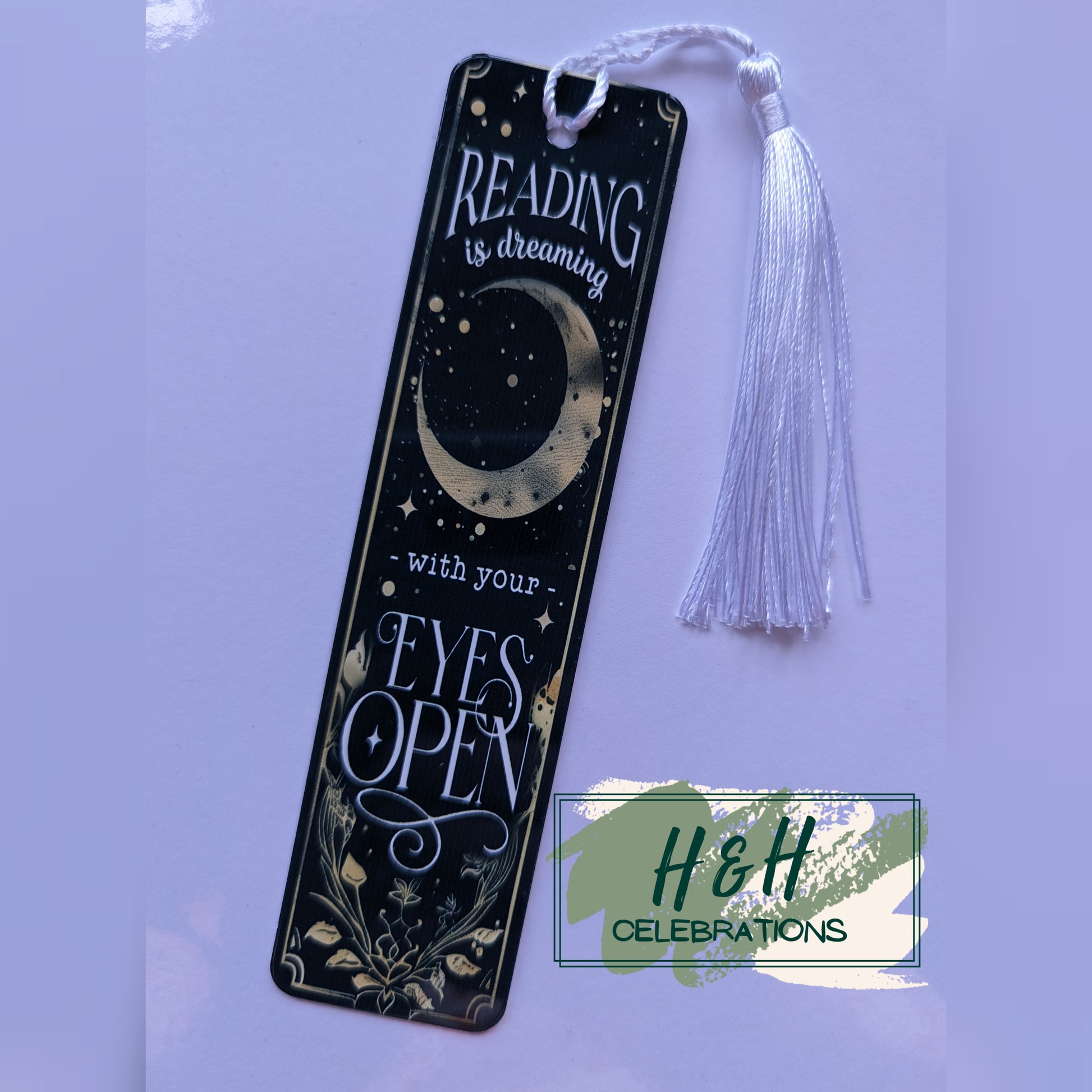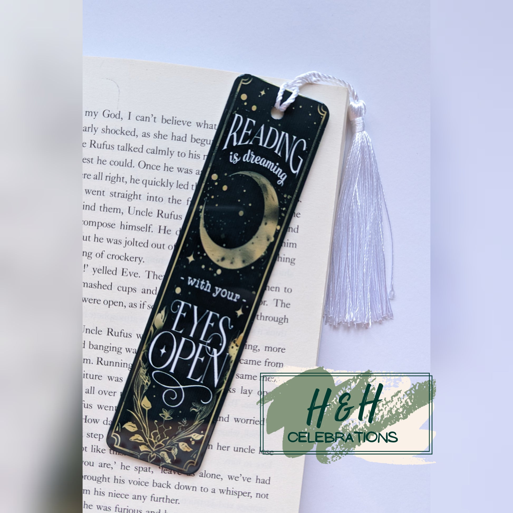 This bookmark depicts a black background with moon image and the wording reading is dreaming with your eyes open to finish.