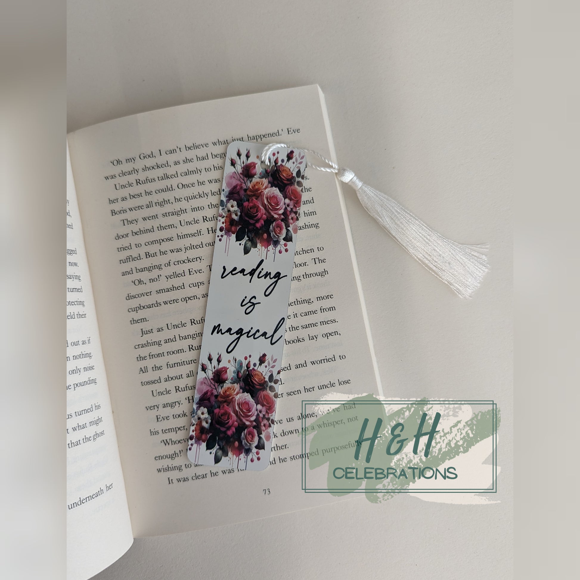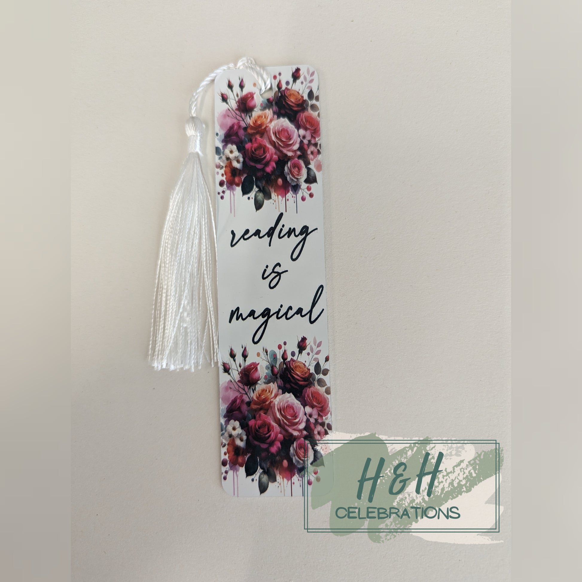 This bookmark depicts watercolour flower arrangements finished with the wording reading is magical.