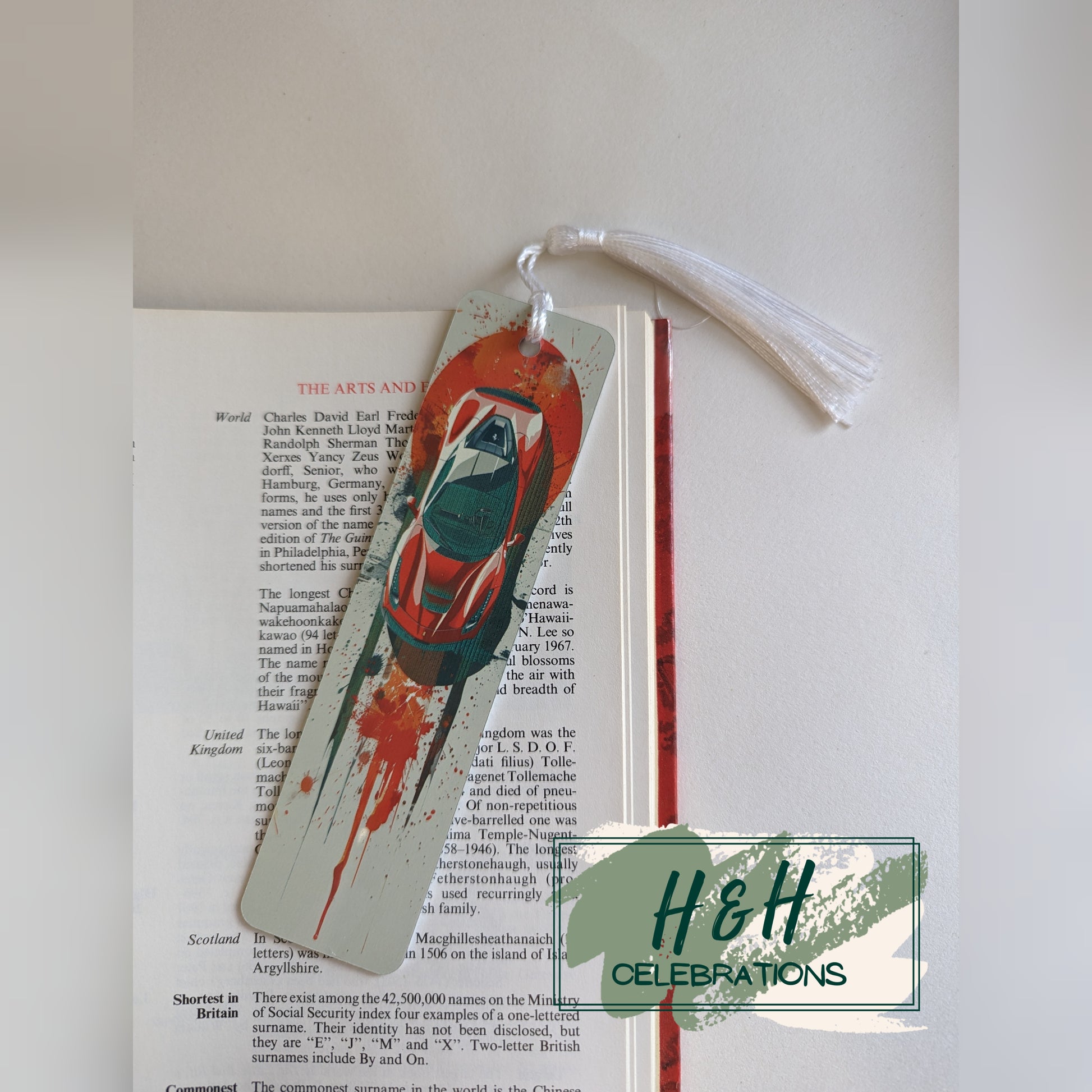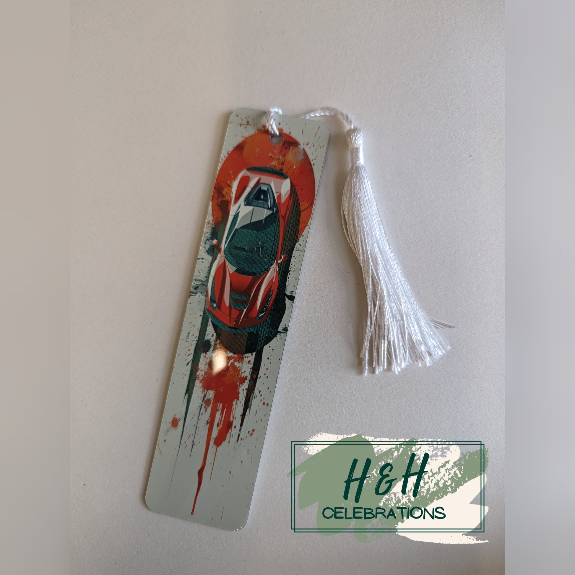 This bookmark depicts a red fast car to finish.