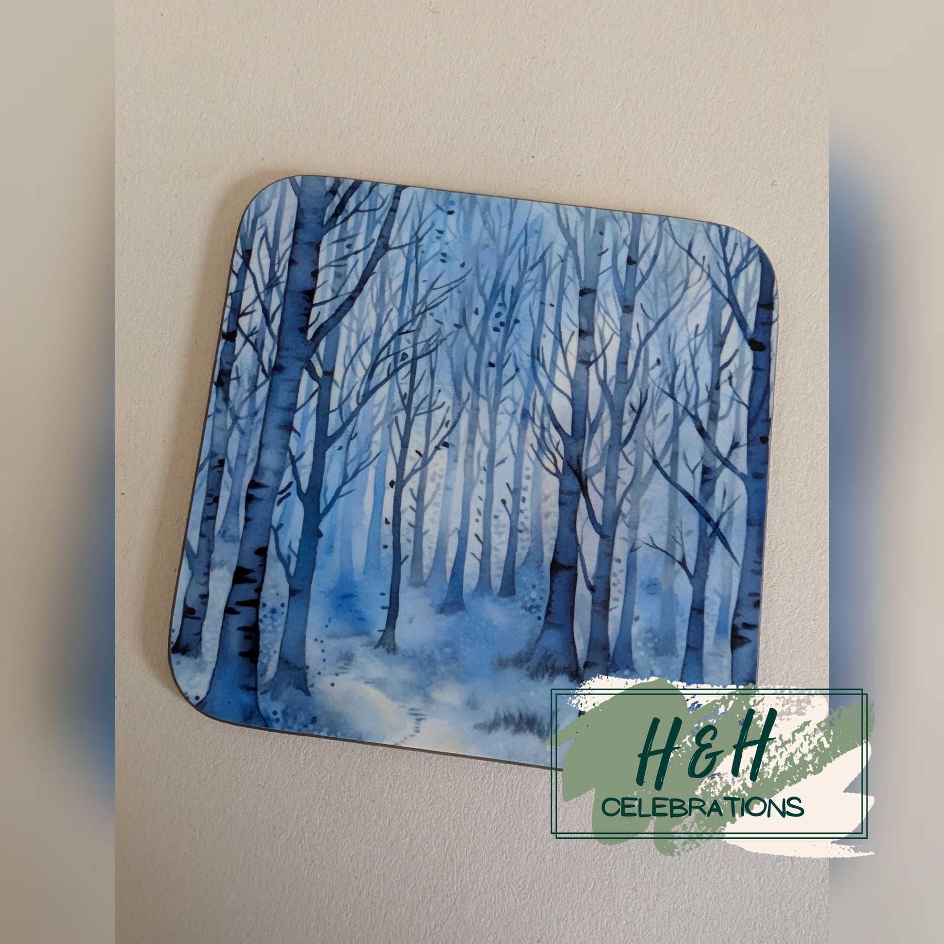 Winter Woodlands Blue And White Print MDF Coaster - Design 3